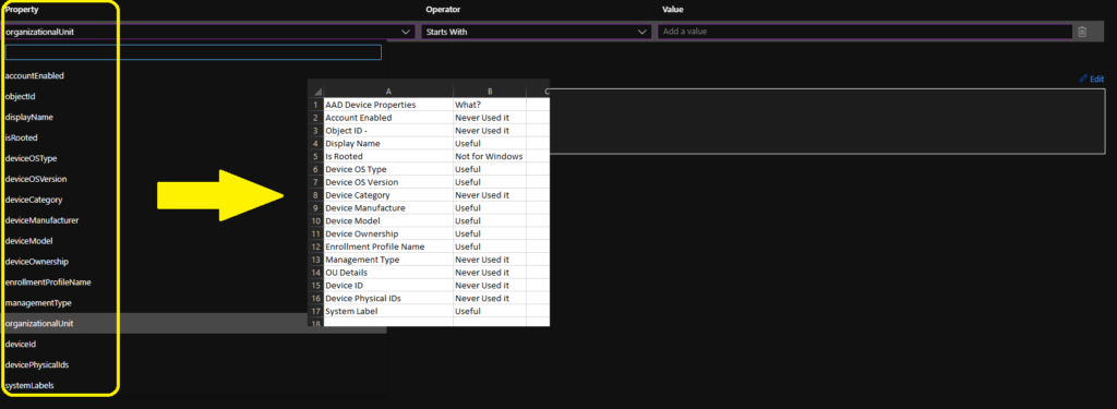 You can create Azure AD dynamic device groups based on available device properties. Well, you can’t create dynamic device groups based on applications installed device (unlike SCCM collections). This is expected because Azure AD is not a device management solution like Intune and SCCM.